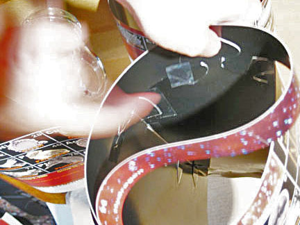 1. Bring outside of loop clockwise so the pair of half rounded tabs on the bottom edge are at the spade shape over Li. 2. Press and rock tabs for strip to go in front of the spade and below and behind the top edge of the element box on each side of the spade. Lay the assembly down between your knees, top toward you. (Observe final assembly in #6 photo/sketch below.) 3. Apply tape neatly to the upper half of the spade, extending on both sides, but not in contact with the strip, then hold the H strip flush and even to top of Li box - left and right - and press the spade tape to the strip on both sides. 4. Check if strip bottom is flush with box top edges on both sides. Tape the straight edges of the curved tabs to the rear of Li and Be. 5. Check to assure all parts are in necessary positions, and if necessary, correct by removing tape or cutting at edges and apply new tape.