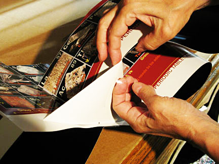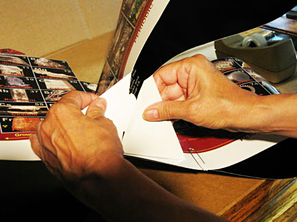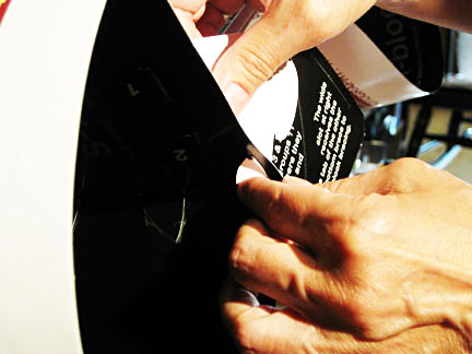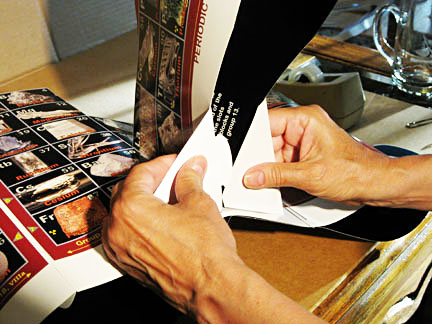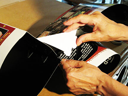 2. Insert small tab into slot, bend up inside - white side showing - and tape. Remove bottom paperclip.