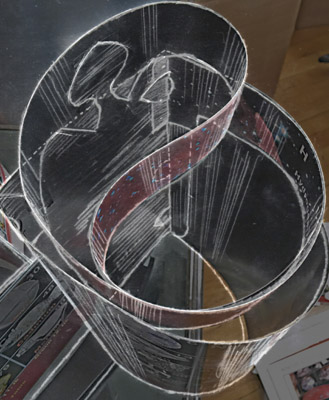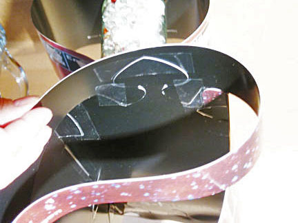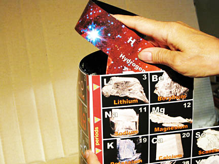 1. Bring outside of loop clockwise so the pair of half rounded tabs on the bottom edge are at the spade shape over Li. 2. Press and rock tabs for strip to go in front of the spade and below and behind the top edge of the element box on each side of the spade. Lay the assembly down between your knees, top toward you. (Observe final assembly in #6 photo/sketch below.) 3. Apply tape neatly to the upper half of the spade, extending on both sides, but not in contact with the strip, then hold the H strip flush and even to top of Li box - left and right - and press the spade tape to the strip on both sides. 4. Check if strip bottom is flush with box top edges on both sides. Tape the straight edges of the curved tabs to the rear of Li and Be. 5. Check to assure all parts are in necessary positions, and if necessary, correct by removing tape or cutting at edges and apply new tape.